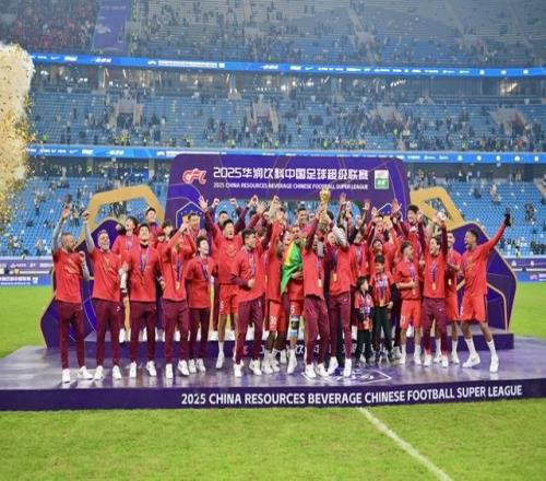 2025年11月22日,上海海港隊(duì)在頒獎(jiǎng)儀式上慶祝奪冠。 當(dāng)日,在遼寧大連舉行的2025賽季中國(guó)足球協(xié)會(huì)超級(jí)聯(lián)賽第30輪比賽中,上海海港隊(duì)客場(chǎng)1比0戰(zhàn)勝大連英博海發(fā)隊(duì),獲得本賽季中超聯(lián)賽冠軍。 新華社記者 吳青昊 攝