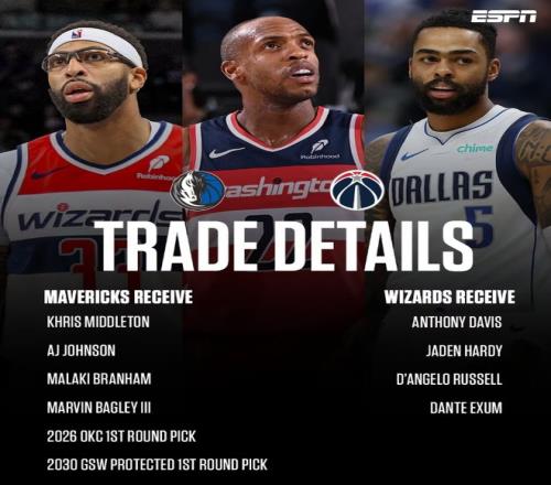 獨(dú)行俠與奇才的4換9大交易同樣震驚聯(lián)盟。安東尼·戴維斯被送往華盛頓,換回了米德爾頓、AJ·約翰遜以及2個(gè)首輪簽。具體交易信息如下: