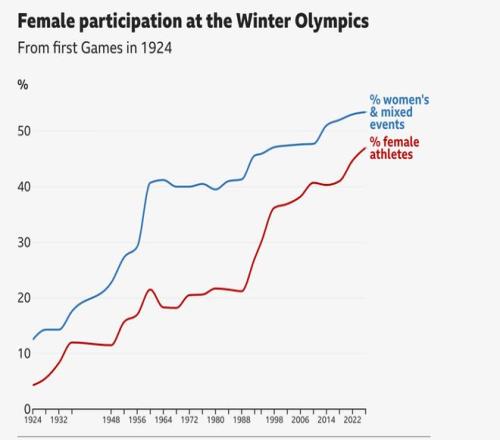 從1924年首屆冬奧會到2026年米蘭冬奧會,女性在冬奧舞臺上的參與度實現(xiàn)了巨大跨越。一百多年前的首屆賽事中,僅有11名女運動員登場,男選手數(shù)量約為她們的25倍。而根據(jù)國際奧委會信息,2026年冬奧會預計將有約1300名女運動員參賽,女性運動員可參與的項目占全部116個小項中的53.4%,創(chuàng)下冬奧歷史新高。