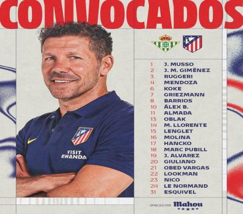 前鋒:7-格列茲曼、10-巴埃納、11-阿爾馬達(dá)、19-阿爾瓦雷斯、20-朱利亞諾-希門尼斯、22-盧克曼、23-尼古拉斯-岡薩雷斯