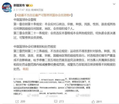 另外“新疆發(fā)布”還轉(zhuǎn)載了中國籃球協(xié)會章程,以及中國籃球協(xié)會紀律準則和處罰規(guī)定。其內(nèi)容明確表示任何球員不得有以下這些行為或不當言論,會員違反本章程或本會規(guī)定的,經(jīng)執(zhí)委會表決通過,可暫停其會員資格。對于造成不良影響的球員,可以處禁賽2-5場的處罰,情節(jié)較為嚴重的可以追究其法律責任,對于球員所在的俱樂部也會有相應(yīng)的罰款或者是核減經(jīng)費,嚴重的甚至會取消其注冊資格等。