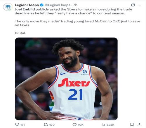 賽前根據(jù)費城記者的報道,恩比德希望球隊在交易截止日前采取行動,因為他認為球隊在本賽季有希望展開競爭。可球隊唯一的運作是將麥凱恩送到雷霆節(jié)省奢侈稅,這太殘酷了。
