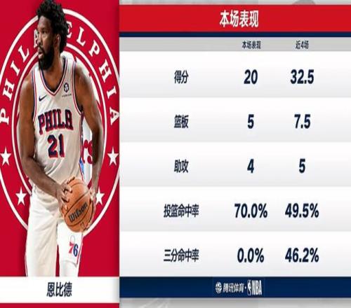 末節(jié)打了4分鐘恩比德就1個出手沒拿分,隨后的6分鐘里恩比德4中2+罰球1中1拿到5分1助攻,決勝時刻球權幾乎都在馬克西手中,球很難再度打到恩比德手中,最終恩比德未能力挽狂瀾再度幫助費城反超。