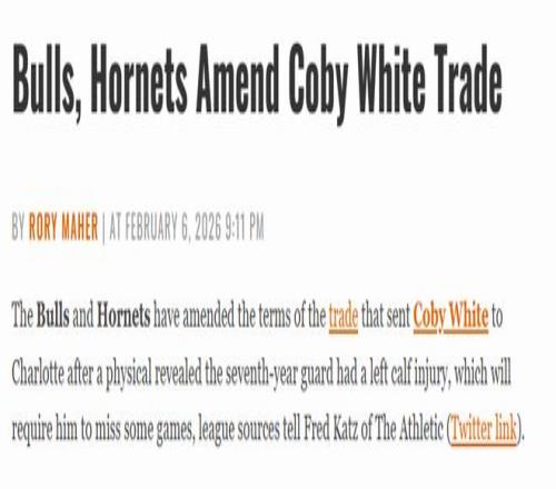 北京時(shí)間2月7日,據(jù)The Athletic報(bào)道,公牛與黃蜂兩隊(duì)已就科迪-懷特的交易條款達(dá)成修改協(xié)議。此前的體檢結(jié)果顯示,這位征戰(zhàn)聯(lián)盟七年的后衛(wèi)左小腿出現(xiàn)傷病,將因此缺席數(shù)場(chǎng)比賽。