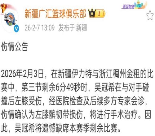然而新疆男籃還是得到了壞消息,根據(jù)球隊方面的官方消息,內(nèi)線大將吳冠希由于膝蓋傷病遭遇賽季報銷。這對于新疆男籃來說打擊不小,畢竟內(nèi)線原本就只有勞森一名外援,李炎哲受傷后狀態(tài)一直都不理想,按照目前的情況來看,新疆男籃有可能會補充一名大外援。