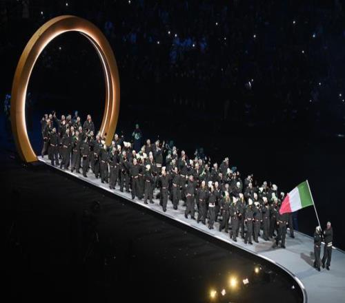 2月6日,意大利體育代表團(tuán)在開幕式上入場。新華社記者 程敏 攝