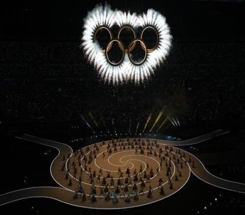 開幕式現(xiàn)場的奧運(yùn)五環(huán)。新華社記者 程敏 攝