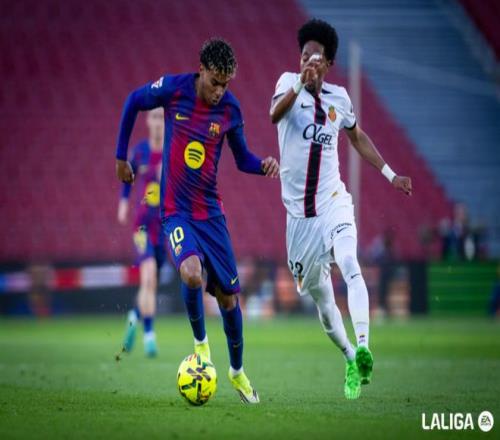 第25分鐘,巴薩打出快速反擊,萊萬分球后全速向前,亞馬爾的傳球差一點就打穿馬洛卡的防線,相當(dāng)懊惱。