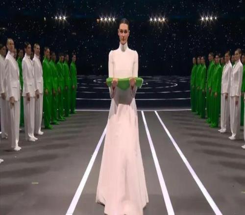 在國(guó)歌聲中,意大利時(shí)裝模特維多利亞·切雷蒂(Vittoria Ceretti)代表東道主意大利在米蘭舉著意大利國(guó)旗亮相。
