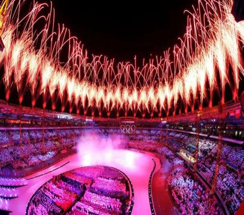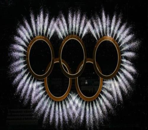 奧運(yùn)五環(huán)周圍綻放出絢麗的煙花。