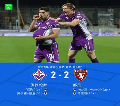 北京時(shí)間2月8日意大利足球頂級聯(lián)賽第24輪,佛羅倫薩主場迎戰(zhàn)都靈。比賽中,都靈率先取得進(jìn)球;隨后佛羅倫薩連入兩球反超比分;但都靈在比賽尾聲階段再度破門,最終兩隊(duì)2-2握手言和。佛羅倫薩方面所羅門、莫伊塞-基恩各入一球,都靈則由切薩雷-卡薩代伊、馬里潘完成破門。