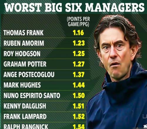 《太陽報》指出,托馬斯-弗蘭克是英超歷史上BIG6豪門里戰(zhàn)績最差的正式主教練,場均僅1.16分,已經(jīng)比阿莫林還少。