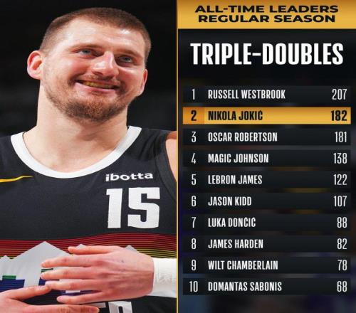 并且約基奇僅花費(fèi)兩節(jié)半時(shí)間就拿下三雙,這樣一來,約基奇生涯三雙次數(shù)來到182次,正式超越大O奧斯卡羅伯特森獨(dú)占NBA歷史三雙榜第二。